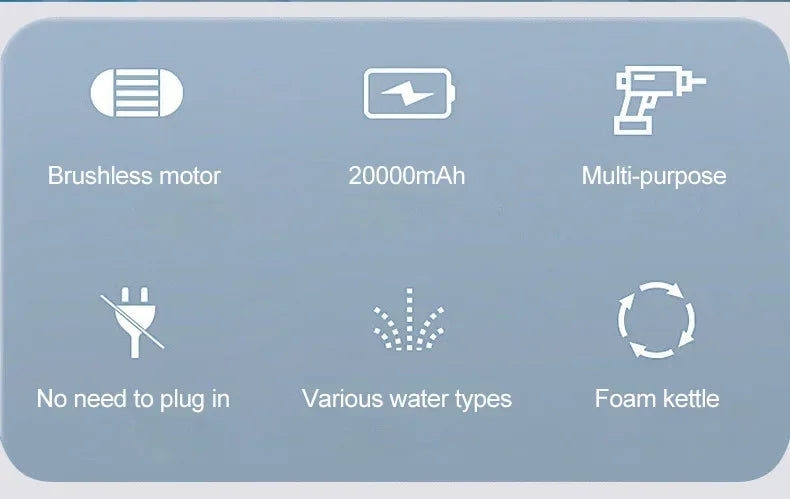 Su diseño inalámbrico, alimentado por una batería de 20,000 mAh, permite usarlo sin depender de enchufes. Incluye una manguera de 5 a 10 metros, múltiples modos de rociado y un montaje intuitivo. Compacto, ligero y listo para múltiples aplicaciones.