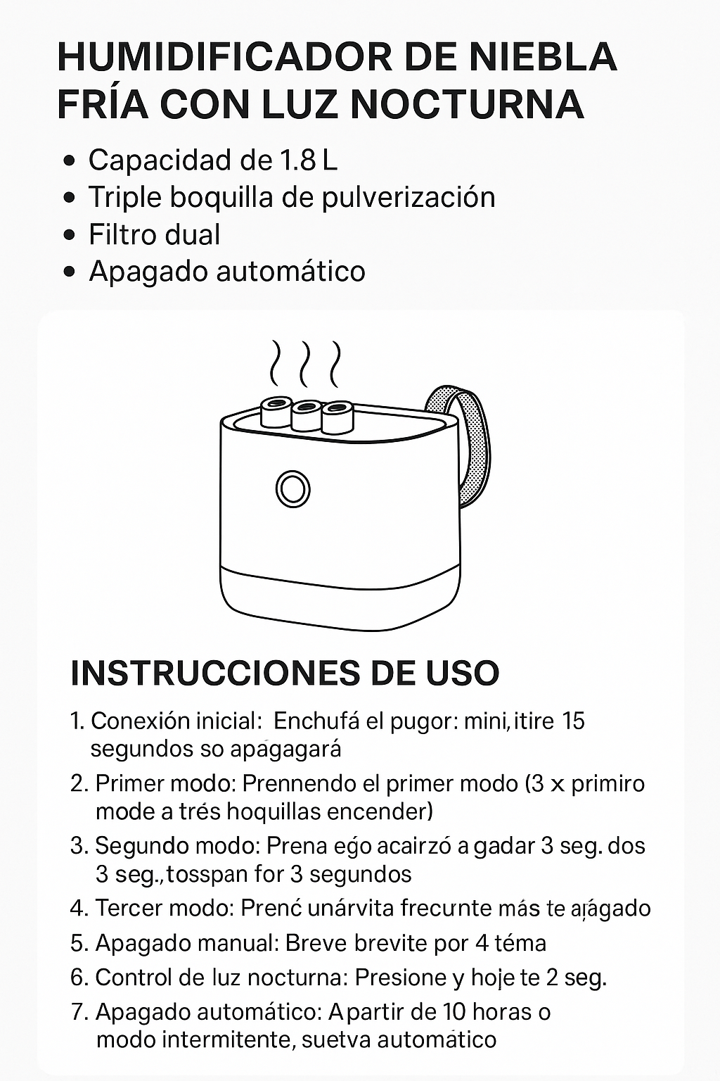 Humidificador de Niebla Fría 1.8L con Luz Nocturna - Triple Boquilla Premium